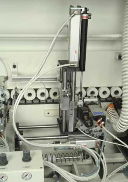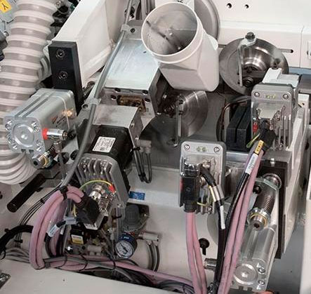 Permite eliminar los excesos de cola en la unión entre el tablero y el canto. También los posibles desbastes de pequeños excedentes de canto. Doble copiador vertical giratorio. Cuchillas descartables autoregulables. Sopladores para la limpieza de las cuchillas. Campana de aspiración.