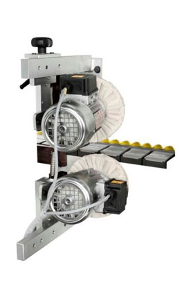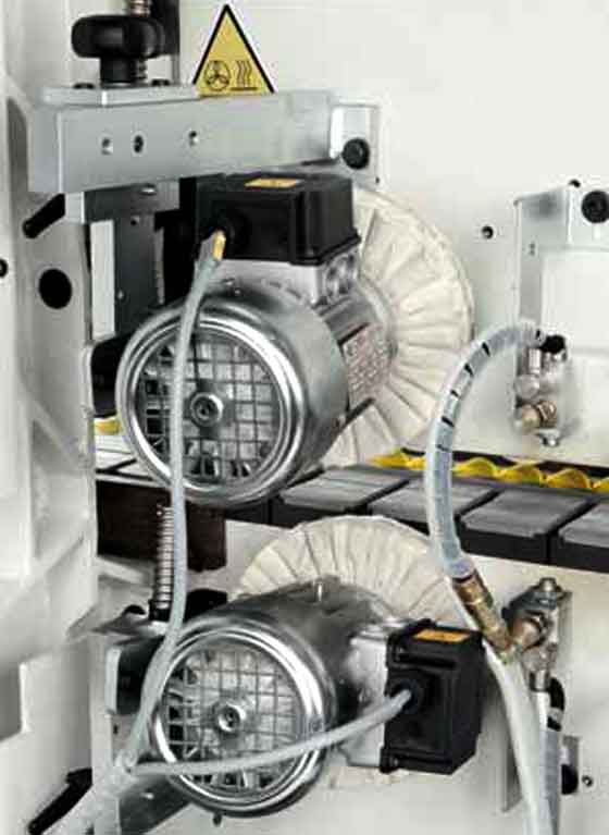 Con dos motores independientes Inclinables a 3.000 r.p.m. (con motores de 0,25 Kw.) Los paños desempeñan la función de pulido, devolviendo al canto de material la brillantez perdida durante las fases anteriores del proceso. Tiene también la función de redondear las aristas vivas dejadas por el refilador cuando trabaja con tableros delgados del papel o melamina.