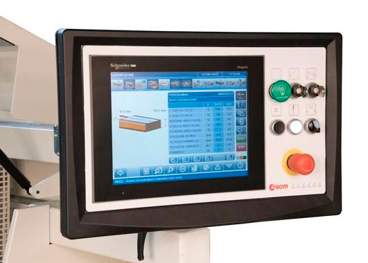 Máquina a control numérico completo de PC - PLC que elimina relee y micro interruptores y permite la ejecución rápida y simple, sin errores de programación (hasta 100 programas). Teclado alfanumérico con Display gráfico a colores de 12” a cristal líquido. Teclas de función para la rápida selección de los grupos de trabajo. Control y regulación de la temperatura del colero. Selección del primer o segundo paso sin cambiar de programa Diagnóstico simple y guiado para fácil solución de eventuales errores. Datos estadísticos de trabajos parciales o absolutos: número de piezas, canto pegado, tiempo de encendido de la máquina, desgaste de la cadena. unidad de medida seleccionable en mm. O pulgadas.