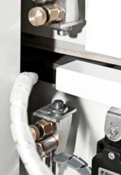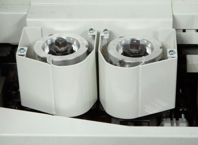 Con dos motores independientes de alta frecuencia de 0,35 Kw. para el corte del canto excedente en la parte anterior y posterior del panel. Motores inclinables automáticamente de 0 a 15 grados con posibilidad de regulación intermedia, sin uso de llaves y activado directamente desde el control de la máquina, agilizando la producción evitando errores manuales. Dos posiciones de trabajo para el corte recto o inclinado del corte desde el tablero de comando. Puede retestar paneles soft-formados. Grupo de elevada precisión de trabajo y fiabilidad gracias al deslizamiento de los motores sobre 2 guías prismáticas con patín a recirculación de esferas que aseguran una total ausencia de juegos en la máxima consecutividad de trabajo. Cada motor es completo de copiadores para posicionar correctamente la sierra respeto del punto de corte, especialmente utilizados sobre cantos en la cara 3 y 4 (cuando 1 y 2 ya están pegados). ISET: activación y posición 1 y 2 desde el tablero de comandos.